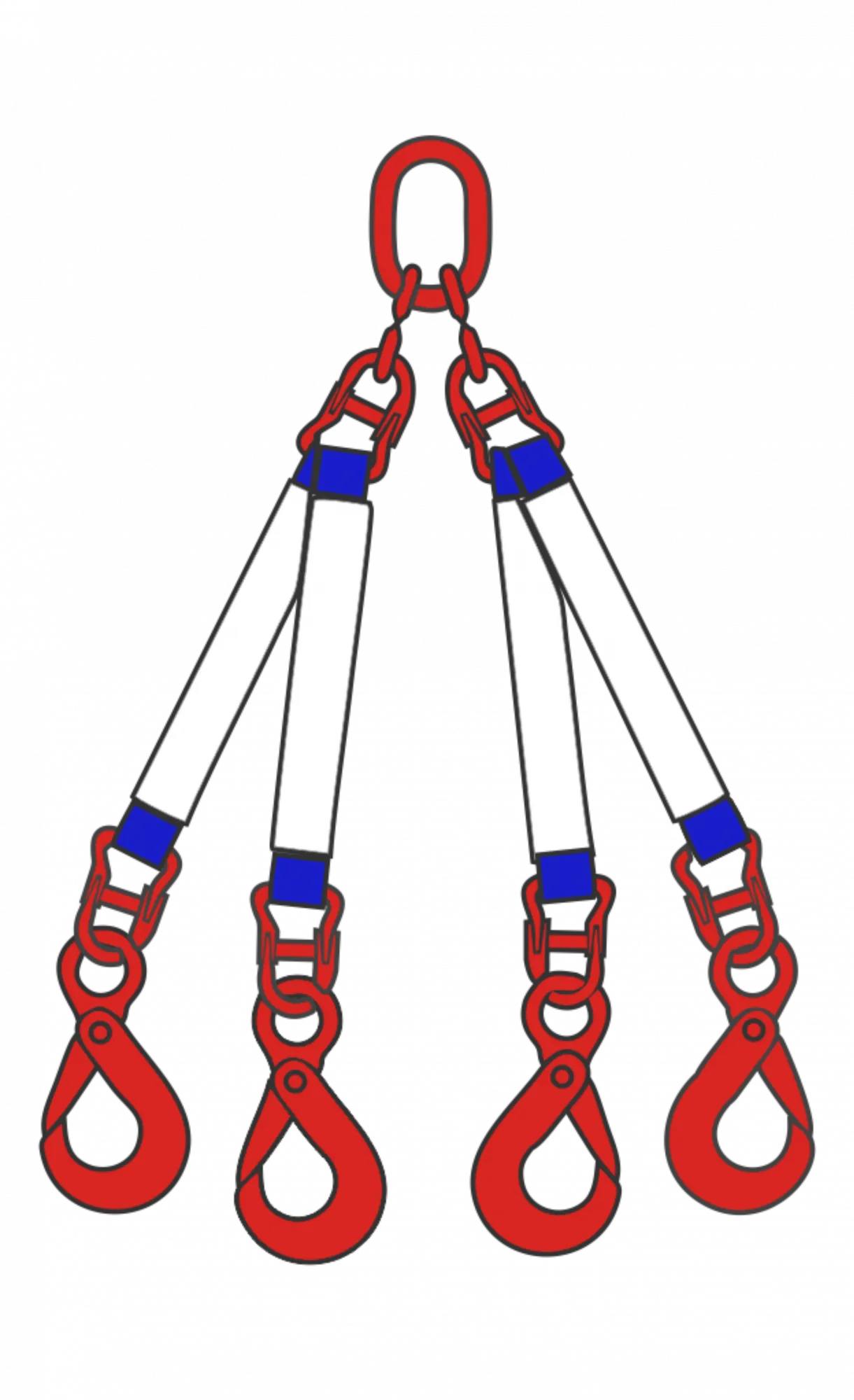 Такое устройство представляет собой четыре несущие ветви (по сути ленточные одноветвевые стропы 1СТ), которые объединены между собой особым подвесным овальным звеном. Петлевые концы каждой ветви обеспечены грузозахватными элементами (концевыми фитингами) — это могут быть скобы, захваты, а чаще всего грузовые крюки с задвижкой или самозакрывающимся стопором. Требования по выпуску и эксплуатации текстильных четырехветвевых строп предусмотрены требованиями Госгортехнадзора в РД-24-СЗК-01-01, ТУ 5225-010-91978384-2011 и другими документами. Плоские ленты строп выпускаются из высокопрочного полиэстера и могут испытывать высокую нагрузку с коэффициентом запаса прочности 7:1.