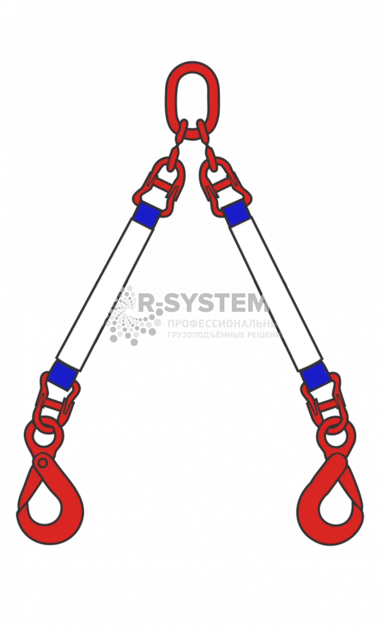Такой строп представляет собой две тканевые ленты, объединенные между собой стальным соединительным звеном и оборудованные концевыми элементами на концах каждой из них — чаще всего чалочными крюками. Изготовление строп происходит по распорядку, разработанному Госгортехнадзором в РД-24-СЗК-01-01. В соответствии с этим документом ветви тканевых строп изготовлены из прочной полиэфирной ленты, а изделие характеризуется запасом прочности 7:1. Все стропы имеют бирку и сопровождаются фирменным паспортом изготовителя Р-Системс.