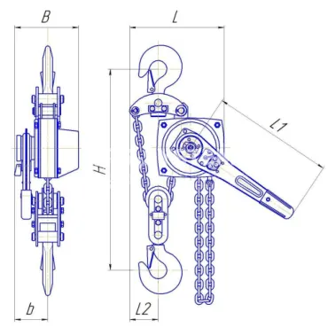 Модель комплектуется двумя ветвями прочной калиброванной цепи и оснащена системой холостого хода для быстрого позиционирования крюка. Гарантия производителя составляет 7 лет при правильной эксплуатации оборудования.